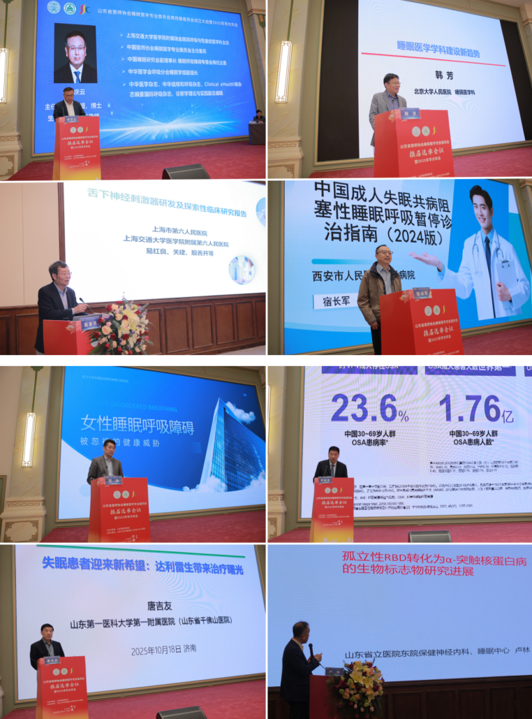 此外,中国医师协会睡眠医学专业委员会主任委员、上海交通大学医学院附属瑞金医院李庆云教授,亚洲睡眠学会主席、北京大学人民医院韩芳教授,中国医师协会睡眠医学专业委员会副主任委员、上海市第六人民医院院长殷善开教授,中国医师协会睡眠医学专业委员会副主任委员、空军军医大学附属唐都医院宿长军教授,中国医师协会睡眠医学专业委员会副主任委员、武汉大学中南医院陈雄教授,应邀就“睡眠呼吸障碍与神经退行性疾病关系”“睡眠医学学科建设新趋势”“舌下神经刺激器的研发及探索性临床研究”“成人失眠共病OSA诊治指南解读”“女性睡眠呼吸障碍疾病”等前沿内容作专题报告。本次大会成功搭建起我省与国内同行交流合作与人才培养的桥梁,为构建高层次、国际化的学科协作体系奠定了坚实基础。不仅为山东省睡眠呼吸障碍疾病的联合诊疗水平提供了有力支撑,也为全省人民的睡眠健康提供了有力的保障。